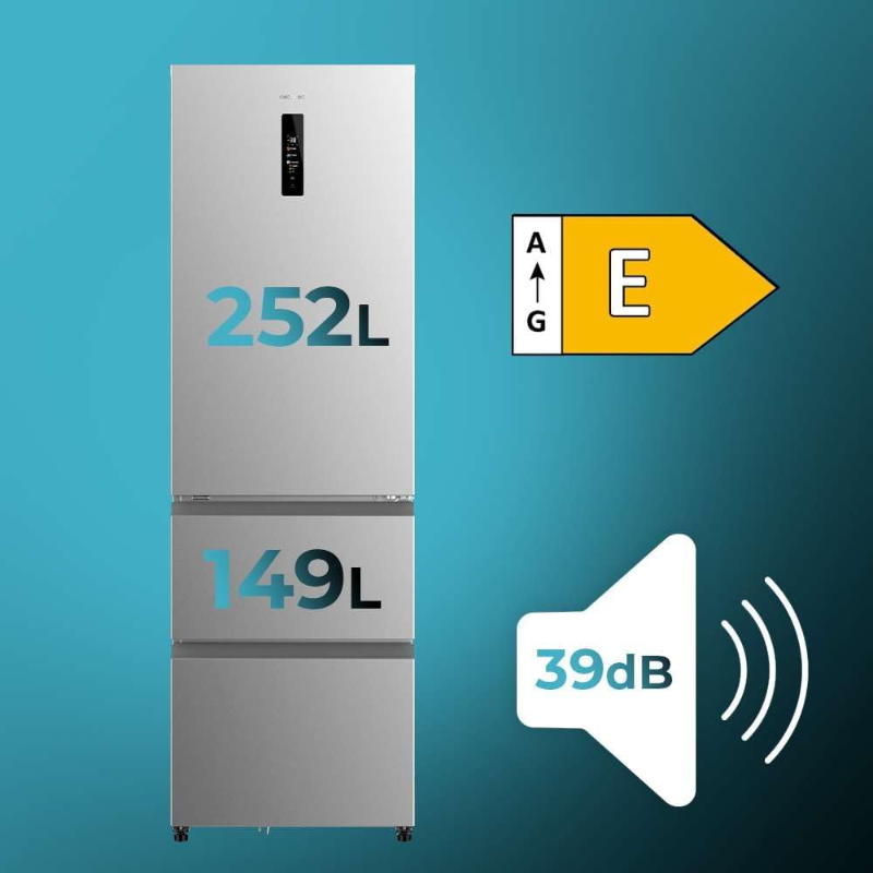 Frigorífico combinado Cecotec Bolero CoolMarket Combi FD 400 con capacidad total de 400 L. Electrodoméstico de refrigeración con compartimento de refrigeración y compartimento de congelación integrados en el mismo equipo para la conservación de alimentos mediante frío. El exterior incorpora acabado inox (acero inoxidable). Identificación comercial: Bolero CoolMarket Combi FD 400; marca Cecotec. La capacidad indicada corresponde al volumen total declarado del aparato (400 litros). Producto de tipo frigorífico combi para instalación como unidad independiente y conexión a red eléctrica según las especificaciones del fabricante.