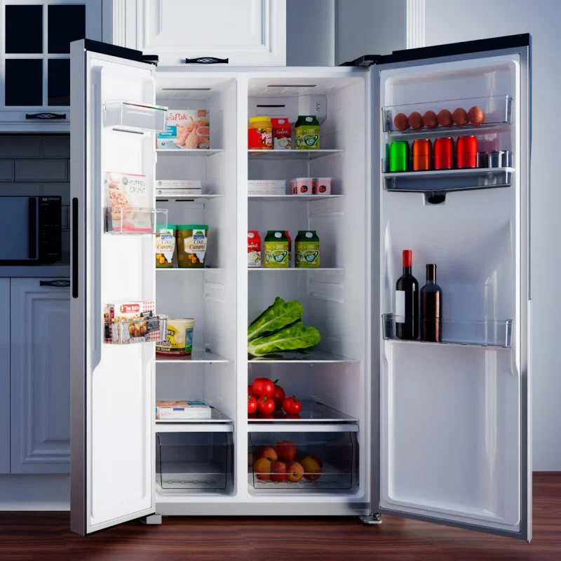 Frigorífico americano COOL AND FREEZE tipo Side by Side (SBS) con capacidad total de 529 L. Construcción con exterior en acero inoxidable. Configuración con compartimento de refrigeración y compartimento de congelación situados en paralelo, accesibles mediante dos puertas verticales independientes. Incluye estantes y balcones en la puerta para distribución interna y cajones para alimentos en la zona de refrigeración; el compartimento de congelación incorpora estantes y cajones para almacenamiento de alimentos congelados. Equipo combinado de frigorífico y congelador destinado a la conservación de alimentos en temperaturas de refrigeración o congelación según el compartimento.