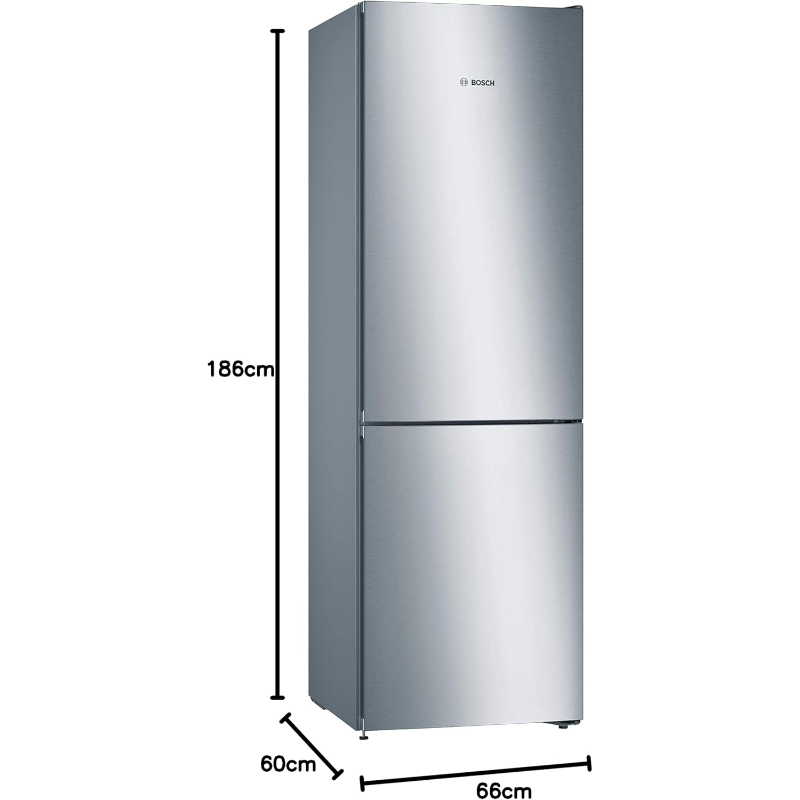 Frigorífico combi de libre instalación Bosch KGN36VLEA con tecnología No Frost y capacidad neta total de 324 L. Distribución: 237 L en el compartimento de refrigeración y 87 L en el compartimento de congelación. Control electrónico de temperatura con indicadores; funciones SuperCooling y SuperFreezing. Sistema MultiAirflow. Iluminación interior LED. En la zona de refrigeración incluye estantes de vidrio de seguridad y balcones en la puerta, además de cajón VitaFresh. El congelador integra 3 cajones. Alarma acústica de puerta. Clase de eficiencia energética E (escala UE 2021). Nivel de ruido 39 dB(A) y clase de emisión de ruido C. Capacidad de congelación 14 kg/24 h y autonomía de conservación sin electricidad 16 h. Dimensiones (alto x ancho x fondo): 1860 x 600 x 660 mm. Puertas con bisagra a la derecha y opción de reversibilidad.