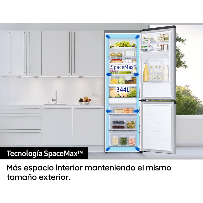 El Samsung RB34C632DSA/EF es un frigorífico combi con sistema No Frost y capacidad total de 344 L. El formato combi integra en un mismo aparato un compartimento de refrigeración y un compartimento de congelación, separados para el almacenamiento de alimentos a distintas temperaturas. La tecnología No Frost corresponde a un sistema de refrigeración con descongelación automática que limita la acumulación de escarcha en el interior durante el funcionamiento. La capacidad indicada (344 L) se refiere al volumen útil total del equipo. Incluye un sistema de regulación de temperatura para el control del circuito de refrigeración y funciones de manejo según la configuración del fabricante. Funcionamiento mediante alimentación eléctrica de red. Identificación del producto: marca Samsung, referencia de modelo RB34C632DSA/EF.