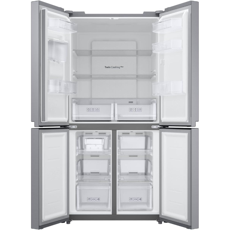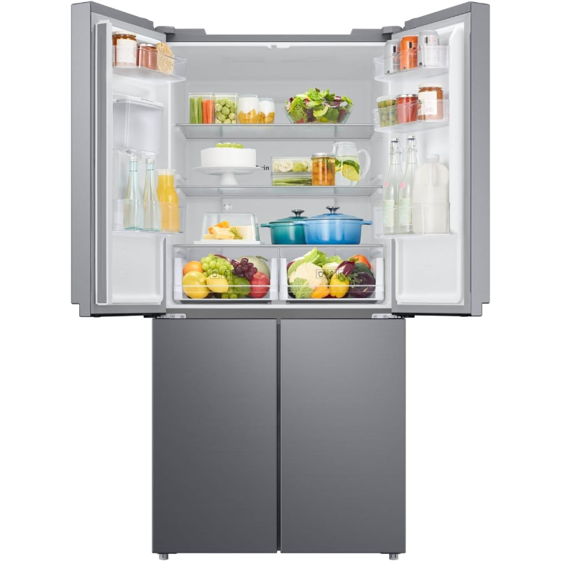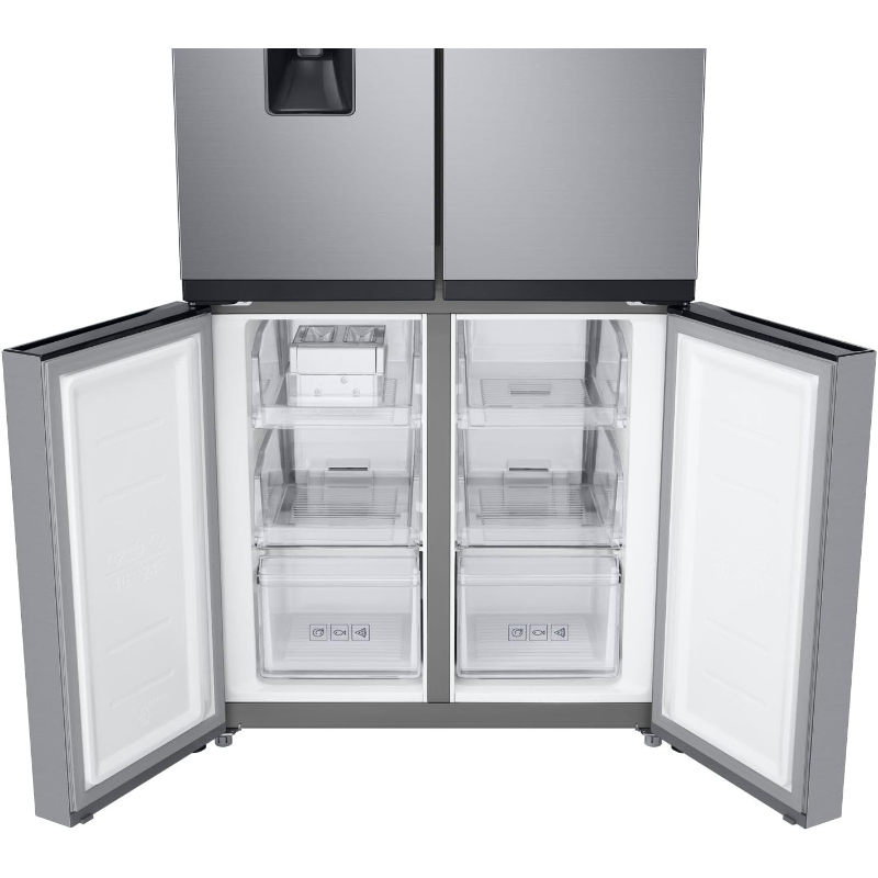 Samsung Refrigerador French Door 488L RF48A401EM9 es un refrigerador eléctrico de la marca Samsung con configuración de puertas tipo French Door y capacidad total de 488 L. El modelo RF48A401EM9 integra compartimentos de refrigeración y de congelación en una sola unidad, con acceso frontal mediante puertas. Denominación del producto: Refrigerador French Door 488L. La capacidad indicada corresponde al volumen interno total declarado para este modelo. Su función es la conservación de alimentos y bebidas mediante refrigeración y congelación, con ajuste de temperatura desde los controles del equipo según la configuración seleccionada. Identificación del producto para catálogo: Samsung RF48A401EM9.