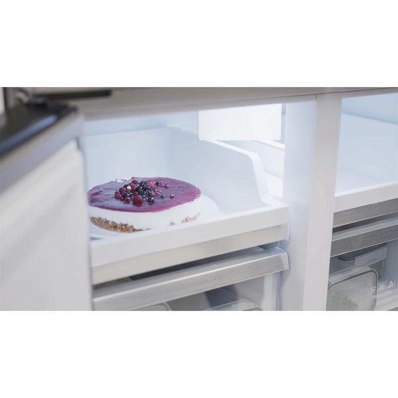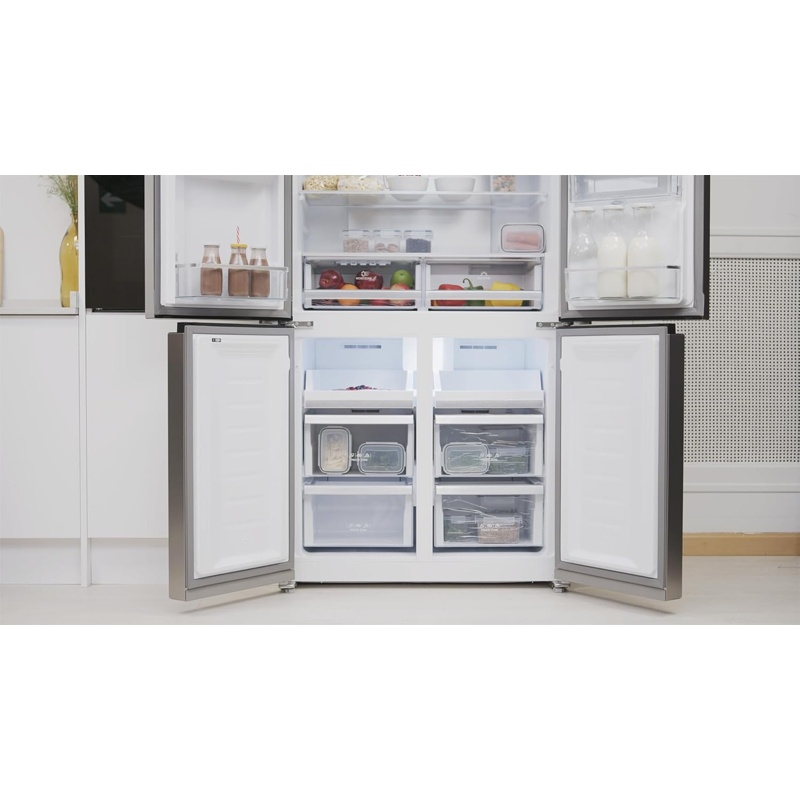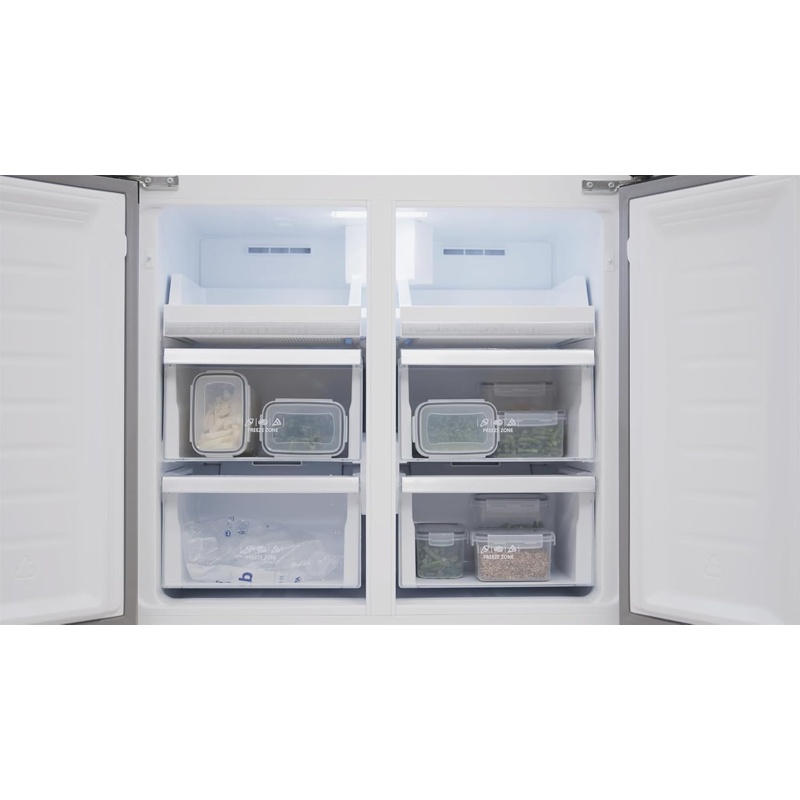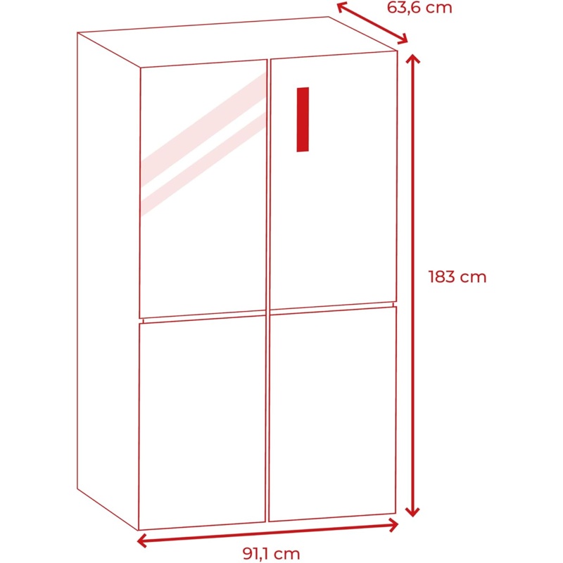 Frigorífico EVVO F100 con configuración de 4 puertas y sistema de refrigeración Total No Frost. Capacidad neta indicada: 321 l en el compartimento de refrigeración y 169 l en el compartimento de congelación (490 l en total). Incorpora motor/compresor Inverter para el control del funcionamiento del sistema de frío. Diseño tipo frigorífico-congelador con zonas diferenciadas para refrigeración y congelación, con acceso independiente mediante sus puertas. Producto eléctrico para conservación de alimentos mediante refrigeración y congelación, con tecnología No Frost declarada por el fabricante.