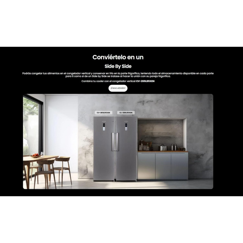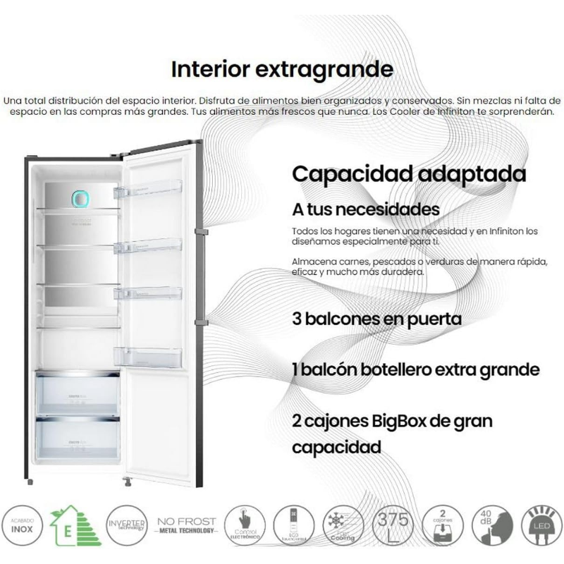 Frigorífico de 1 puerta Infiniton modelo CL-360L85XEN, con capacidad total de 375 L. Incorpora sistema de refrigeración No Frost, basado en circulación de aire frío mediante ventilación y ciclos automáticos de desescarche integrados en el funcionamiento del equipo. Formato vertical con compartimento principal de refrigeración accesible a través de una única puerta frontal. Diseñado para la conservación de alimentos y bebidas mediante enfriamiento por compresor, con distribución del frío en el interior realizada por el sistema No Frost. Identificación del producto: marca Infiniton, referencia CL-360L85XEN, tipo frigorífico 1 puerta, capacidad 375 L, tecnología No Frost.