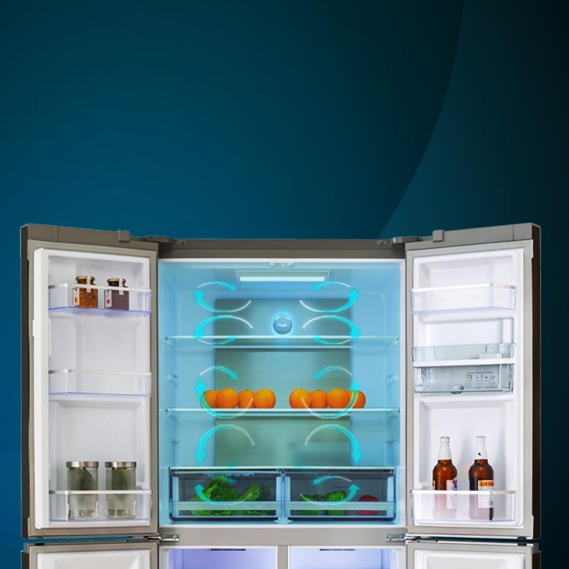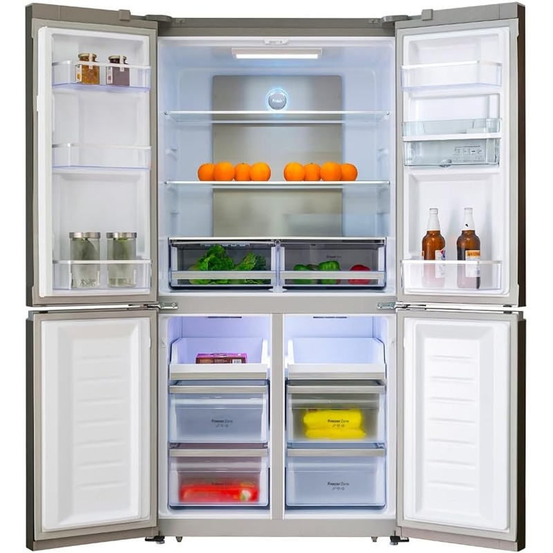 Frigorífico americano Cecotec Bolero CoolMarket 4D 564 con capacidad total de 560 L. Configuración 4D con cuatro puertas y dos zonas principales: refrigeración y congelación. Sistema NoFrost con descongelación automática para evitar la descongelación manual asociada a la acumulación de escarcha. Clasificación energética E según la etiqueta energética de la Unión Europea. Producto destinado a la conservación de alimentos refrigerados y congelados mediante control de temperatura en sus compartimentos. Marca: Cecotec; serie: Bolero; denominación del modelo: CoolMarket 4D 564.