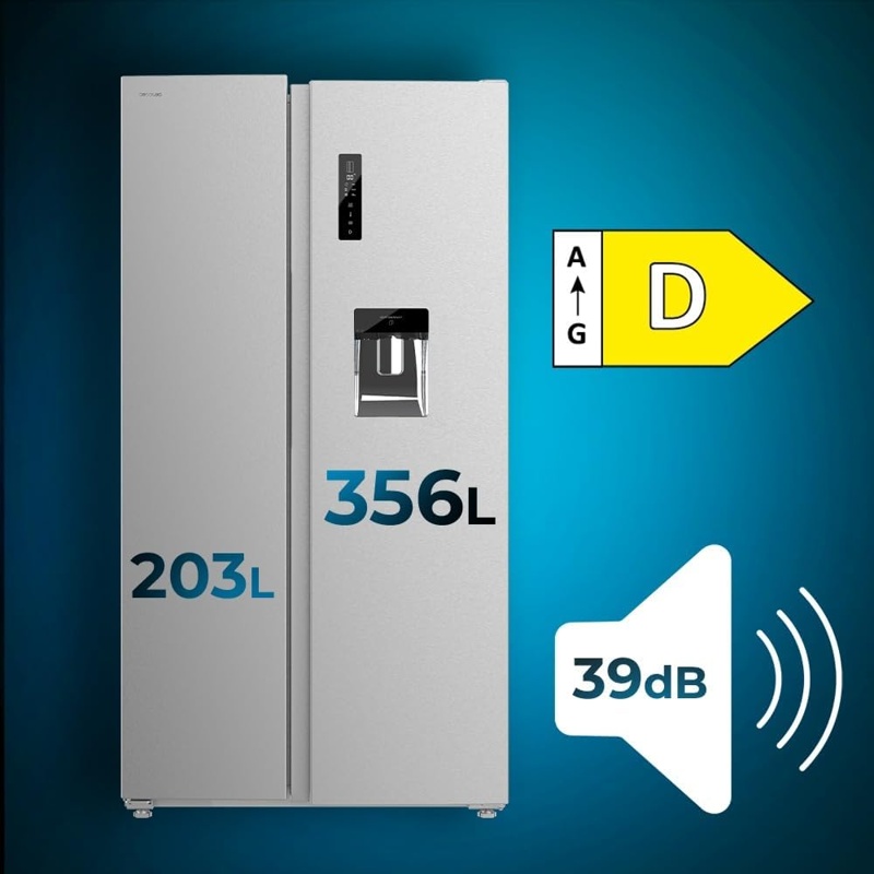 Frigorífico americano Cecotec Bolero CoolMarket SBS 562 con configuración side-by-side y dos compartimentos verticales separados: frigorífico y congelador. Capacidad total declarada de 559 L. Sistema NoFrost con descongelación automática en el compartimento de refrigeración y en el compartimento de congelación. Clasificación energética D según la etiqueta energética de la Unión Europea. Formato de instalación libre (freestanding). Apertura mediante dos puertas frontales; distribución interior orientada al almacenamiento de alimentos y bebidas en frío y en congelación. Modelo identificado como SBS 562 dentro de la serie Bolero CoolMarket de Cecotec.