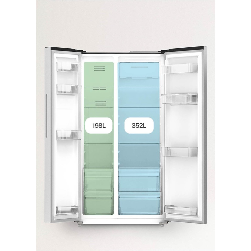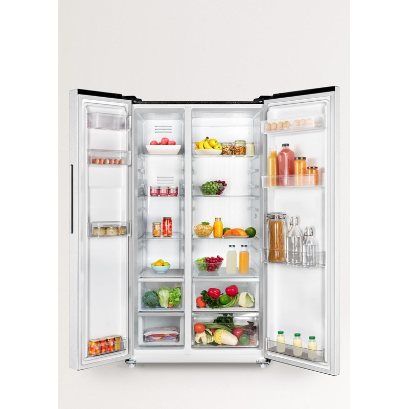 Frigorífico americano CREATE FRIDGE STUDIO con configuración Side by Side, con compartimentos de refrigeración y congelación en columnas verticales y puertas independientes. Capacidad total: 550 L. Sistema de refrigeración NoFrost con descongelación automática. Clase de eficiencia energética: E (según la etiqueta energética de la UE). Diseño de instalación como electrodoméstico independiente para conservación de alimentos mediante refrigeración y congelación. Incluye funciones propias de un frigorífico-congelador Side by Side con distribución interna separada por zonas de temperatura para refrigeración y para congelación, controladas por el sistema NoFrost. Marca: CREATE. Modelo/línea: FRIDGE STUDIO.