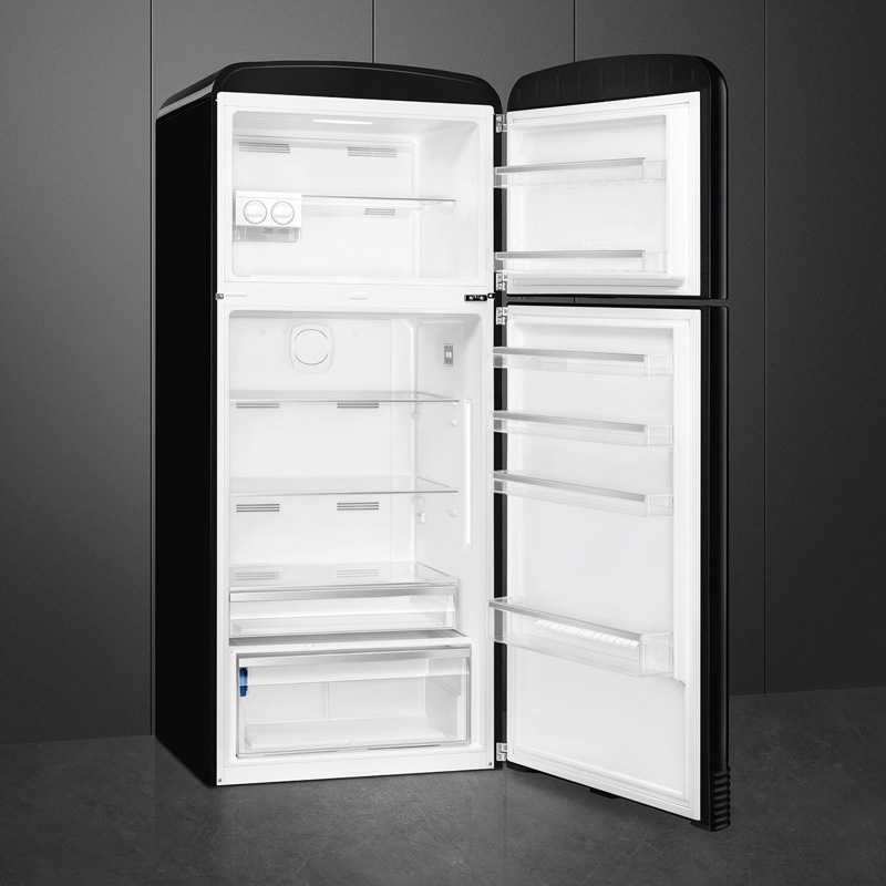 SMEG FAB50RBL5 es un frigorífico americano con capacidad total de 524 L y clasificación energética E según el etiquetado energético de la Unión Europea (escala A–G). Electrodoméstico destinado a la conservación de alimentos mediante refrigeración y congelación, con compartimentos diferenciados dentro del mismo equipo. Configuración de dos puertas con acceso separado a cada zona. El modelo FAB50RBL5 incluye sistema de control para el ajuste de temperatura y el funcionamiento del aparato. La organización interior se realiza mediante estantes y compartimentos de almacenamiento, con espacios específicos para productos refrigerados y congelados. Marca: SMEG; referencia de modelo: FAB50RBL5.