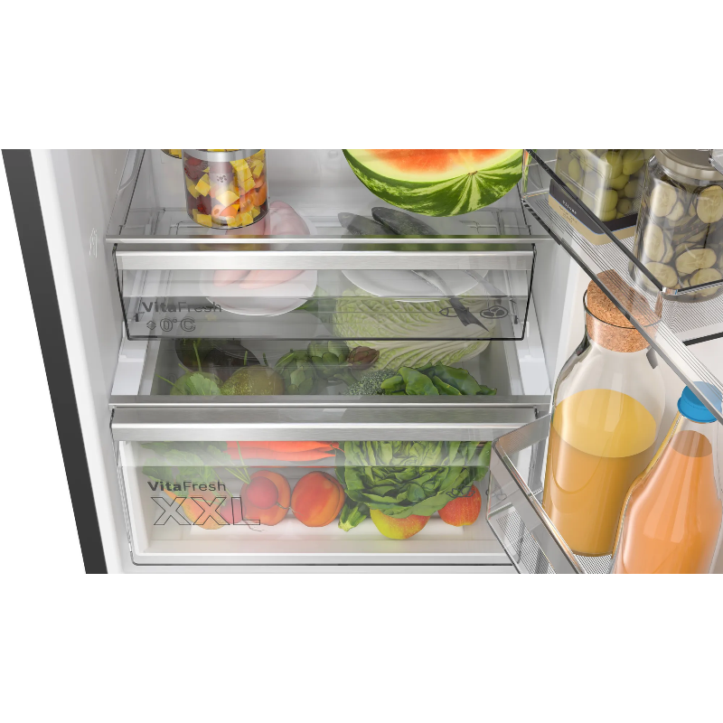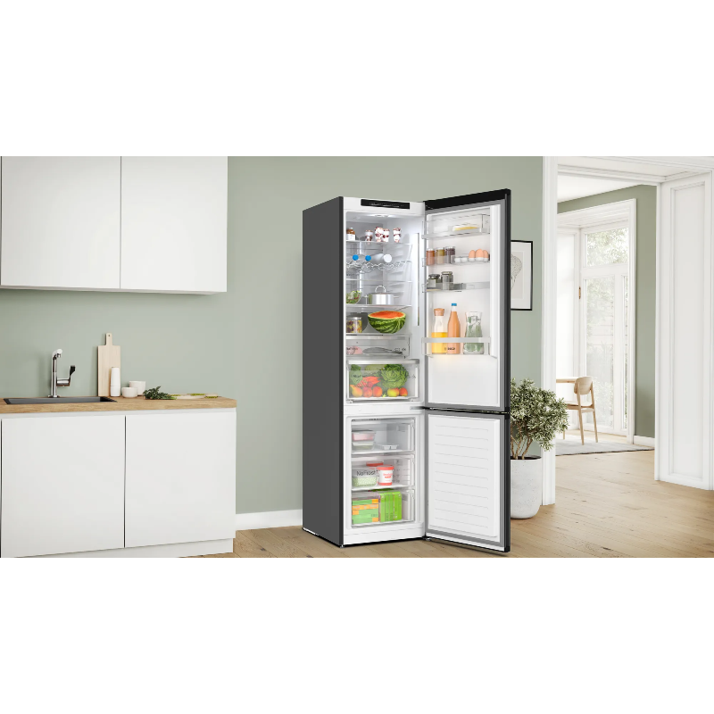 Frigorífico combi Bosch KGN39LBCF con sistema No Frost y capacidad total de 363 L. Configuración con dos compartimentos independientes: frigorífico y congelador, con puertas separadas. El sistema No Frost realiza descongelación automática para la gestión de escarcha, según la tecnología indicada en el modelo. El compartimento frigorífico incorpora estantes y compartimentos de puerta para organización de alimentos y bebidas; el compartimento congelador integra cajones para la colocación de productos congelados. Control de temperatura mediante mandos integrados en el aparato para el ajuste de los compartimentos. Producto perteneciente a la gama de frigoríficos de libre instalación de Bosch, identificado por la referencia KGN39LBCF.