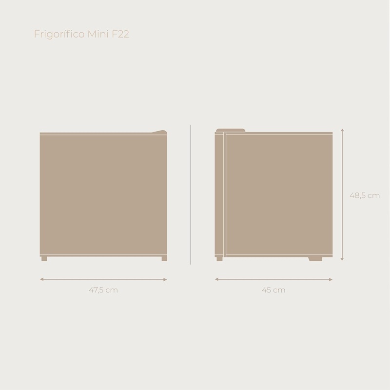 EVVO Frigorífico F22X: electrodoméstico de refrigeración diseñado para el almacenamiento de alimentos y bebidas a temperatura inferior a la ambiental. Capacidad declarada: 46 L. Emisiones acústicas declaradas durante el funcionamiento: 41 dB. Clasificación de eficiencia energética: clase E según la escala de la etiqueta energética de la Unión Europea. El producto se identifica por marca EVVO y modelo F22X para su registro y compatibilidad con recambios o documentación técnica del fabricante. Estos datos corresponden a especificaciones de capacidad, nivel sonoro y eficiencia energética indicadas para el modelo.