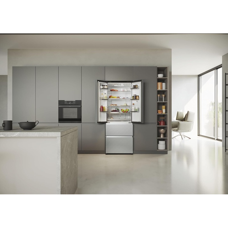 Haier HFR5719ENMG es un frigorífico de puerta francesa con capacidad total de 446 L. La clasificación energética es E según el etiquetado energético de la UE. Presenta configuración de puertas tipo French Door, con dos puertas frontales para el compartimento de refrigeración y un compartimento de congelación situado en la zona inferior. El ancho es de 70 cm y la altura de 190 cm. Está destinado a la conservación de alimentos mediante refrigeración y congelación en compartimentos separados. El modelo se identifica por la referencia HFR5719ENMG del fabricante Haier.