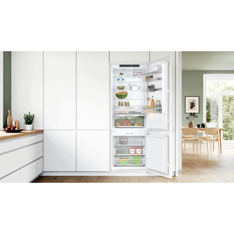 Frigorífico combi integrable Bosch Serie 6, modelo KBN96ADD0, con capacidad total de 284 L. Electrodoméstico de instalación integrable para montaje empotrado en mueble y colocación de panel frontal de cocina (no incluido). Configuración tipo combi con compartimentos separados para refrigeración y congelación con puertas independientes. Sistema No Frost basado en circulación de aire y ciclos automáticos de descongelación del evaporador, sin necesidad de descongelación manual asociada a sistemas estáticos. Función principal: conservación de alimentos mediante refrigeración y congelación en dos zonas diferenciadas. Marca: Bosch. Serie: 6. Modelo: KBN96ADD0. Capacidad: 284 litros. Tecnología de frío: No Frost.