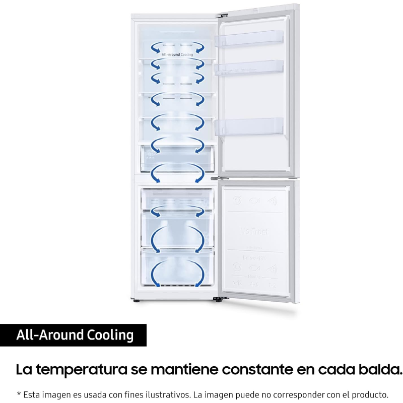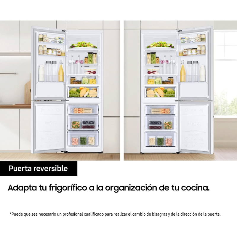 Samsung Frigorífico Combi RB34C600DWW/EF con capacidad de 344 L. Frigorífico-congelador en formato combi, con compartimento de refrigeración y compartimento de congelación para conservación de alimentos a diferentes rangos de temperatura. El sistema de frío se basa en un circuito de refrigeración con compresor y control de temperatura mediante regulador interno. El interior incorpora elementos de almacenaje para la colocación de recipientes y productos, y el compartimento de congelación incluye zonas separadas para organizar alimentos congelados. Aparato alimentado por red eléctrica; incluye iluminación interior para visibilidad del contenido. Identificación del modelo: RB34C600DWW/EF (Samsung).