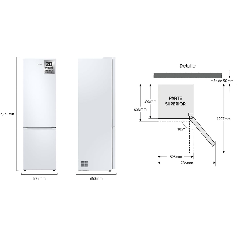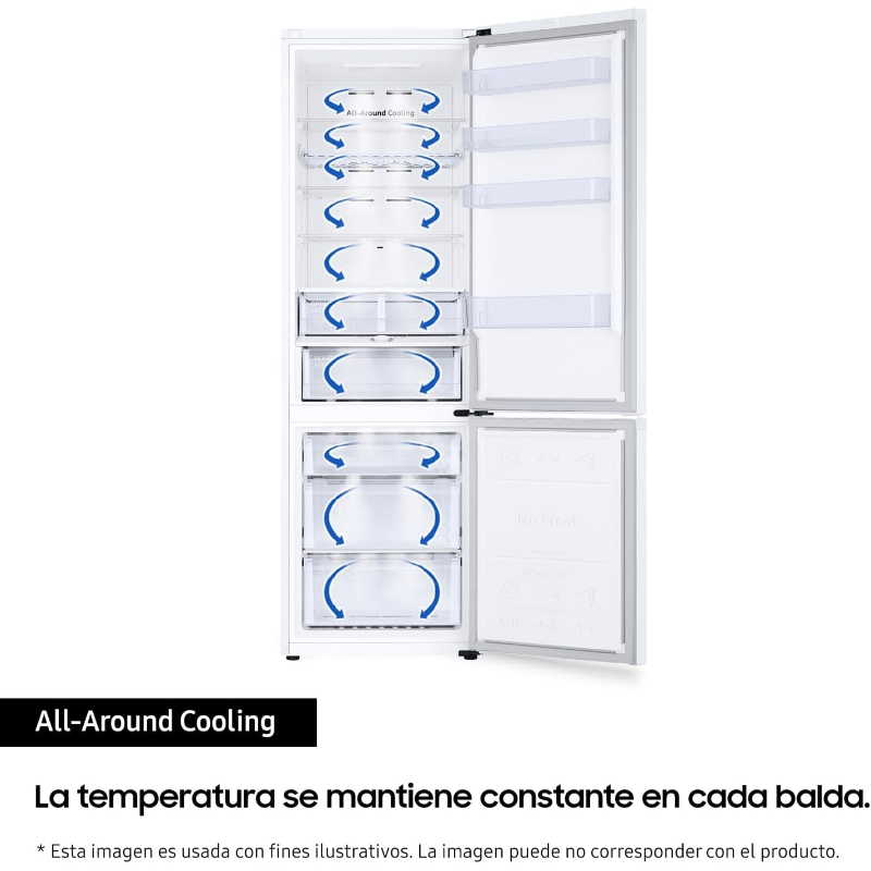 Samsung Frigorífico Combi RB38C600EWW/EF con capacidad neta total de 390 L. Electrodoméstico de refrigeración de tipo combi, con dos compartimentos en un mismo equipo: compartimento frigorífico y compartimento congelador, con el congelador situado en la parte inferior. Tecnología No Frost, con circulación de aire y descongelación automática para el funcionamiento del frigorífico y del congelador. Incorpora sistema de control para el ajuste de temperatura de los compartimentos y señalización mediante panel de mando. El interior está destinado al almacenamiento de alimentos refrigerados y congelados e incluye elementos de organización como estantes y compartimentos. Modelo identificado por la referencia RB38C600EWW/EF.